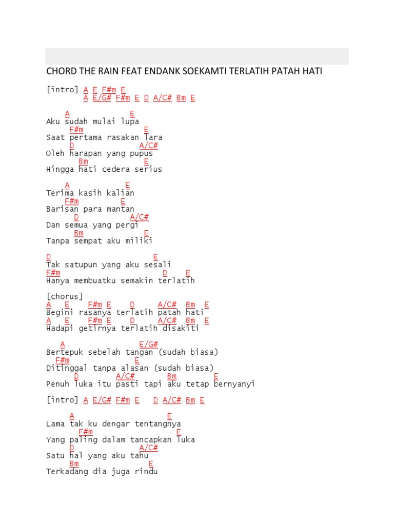 Pro Access 80 OFF. Capo di fret 2 Intro G D Em D G D Em D C Bm Am D G D Aku sudah mulai lupa Em D Saat pertama rasakan lara C Bm Oleh harapan yang pupus Am D Hingga hati cedera serius G D Terima kasih kalian Em D Barisan para mantan C Bm Dan semua yang pergi Am D Tanpa. Kunci Gitar The Rain - Terlatih Patah Hati feat.